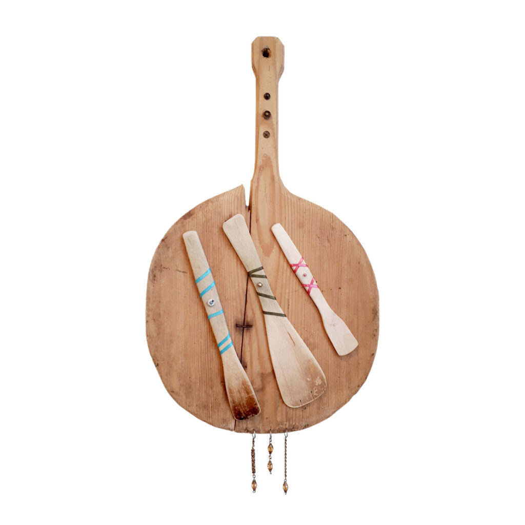 Material: bakspade, träspadar, halsband, sidenband från kläder, knappnål, klädhyskor.