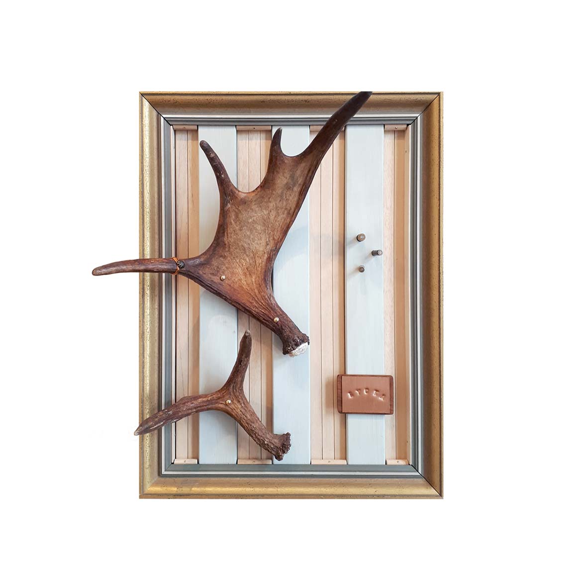 Material: älghorn, sängribbor, delar från vävstol, tomhylsor, möbelspik, koppartråd, medalj, spets.