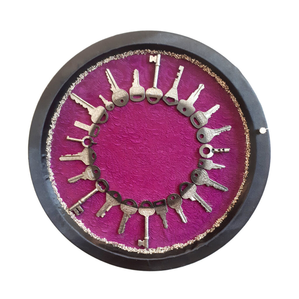 nyckelring nyckelring 32 x 32cmMaterial: bricka, stuvbit, halsband, nycklar.Kan hänga på vägg.Pris: 2 300kr Köp konstverket! <<Tillbaka till galleriet